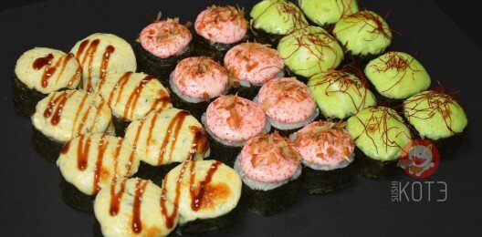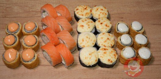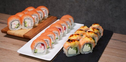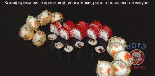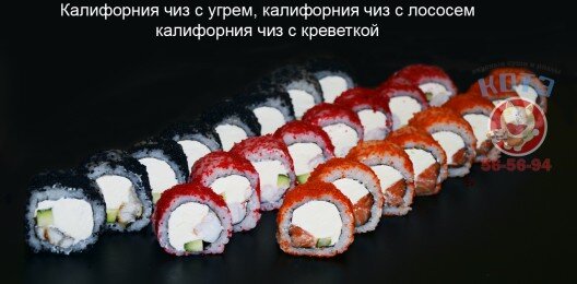 Ролл «Филадельфия», ролл «Калифорния чиз» с креветкой, ролл «Унаги маки», запеченный ролл с креветкой