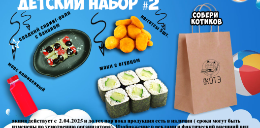 Детский набор #1 1)картофель фри (110гр) 2)наггетсы (5шт) 3)сладкий спринг-ролл бананом (спринг-тесто, банан, сливочный сыр, топпинг шоколад + клубника) 4)морс клюквенный 0.33 5)котик-подставка под кружку